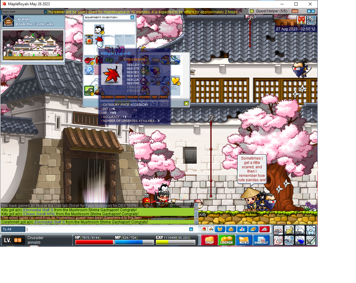 Hello, reporting a very minor issue. About 20 minutes before server went down yesterday, I completed the Secret of the Ninja Castle quest and received a 100% Dex for Face accessory scroll. I'm a casual player so I decided to just apply it to my face accessory for fun since it had slots left. System message showed it worked (since it's a 100% scroll). But when I check the item I don't see DEX added? I don't really remember the stats I started off with since it was a while back that I got this, but there should at least be 1 DEX after scrolling. Not sure if someone can look into this..thanks!