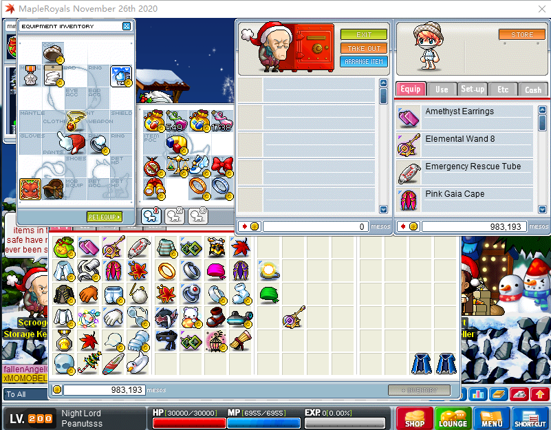 IGN:Peanutsss Problem:After this SC nl gears dispealed last thing do: AT FM closed store and save gears to scrooge then ser off and wait Fix time when log again scrooge all dispealed Lost: nl top bottom caple glove sock weapon ring 34luck 12dex red pirate top 17luck 30dex red pirate bottom 24wa scg 22wa pgc 21wa sock and 1str 6dex 1int 6luck ring 95wa 18luck dps
