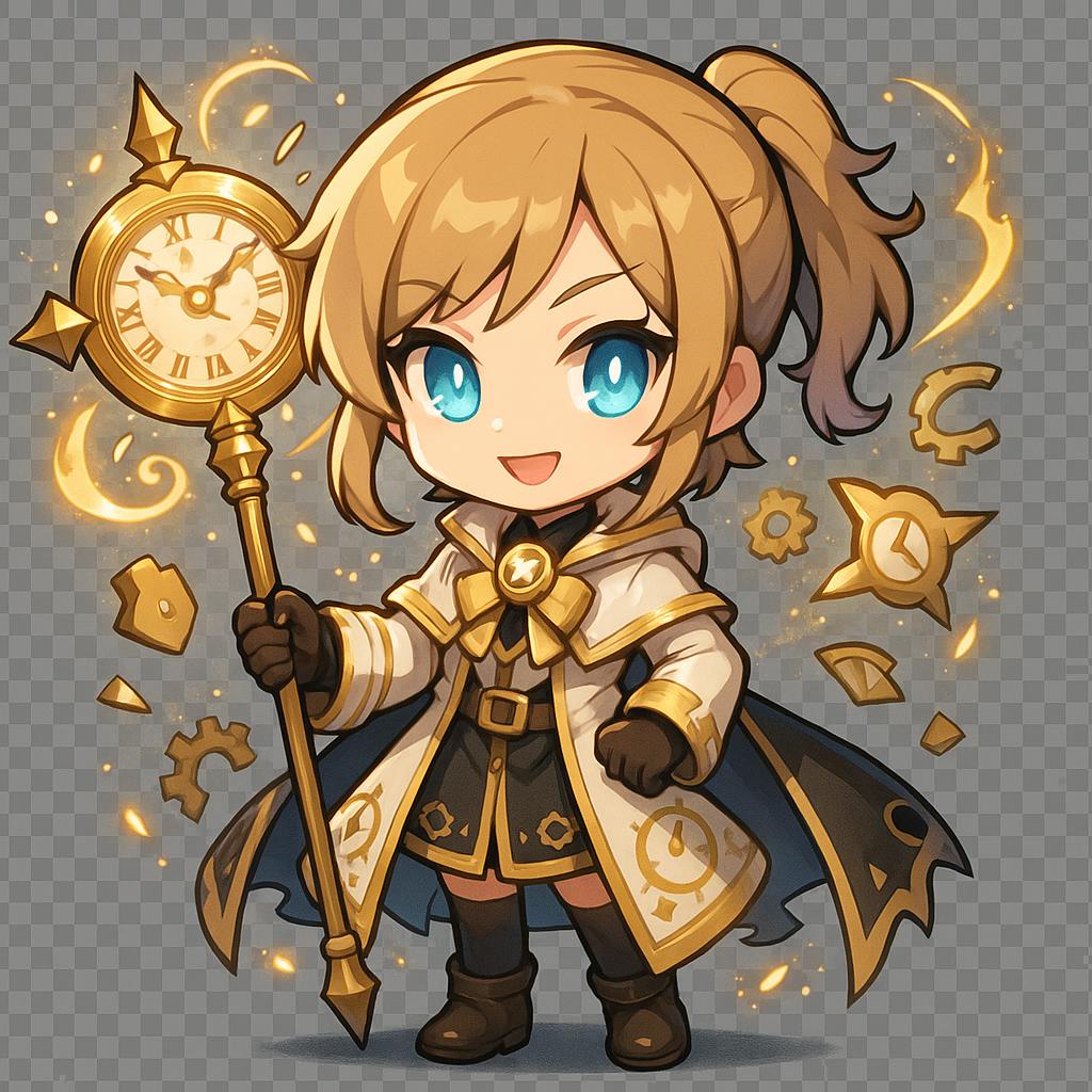 Description Block (Chronomage Traveler) A clever young mage with sandy blonde hair tied into a short ponytail, her bright blue eyes glowing with the shifting light of time itself. She wears a stylish ivory-and-gold mage coat patterned with gears, clocks, and hourglass motifs, paired with dark stockings and polished boots. A pocket watch-shaped brooch glows at her collar, pulsing faintly with arcane energy. She wields a golden staff tipped with a rotating clock face, its hands moving with a will of their own, glowing with streams of temporal magic. Around her float golden gears, shattered clock fragments, and glowing sand-like motes suspended in the air, embodying her mastery over time travel and chronomancy. Her confident smile suggests she is always one step ahead, no matter the era.