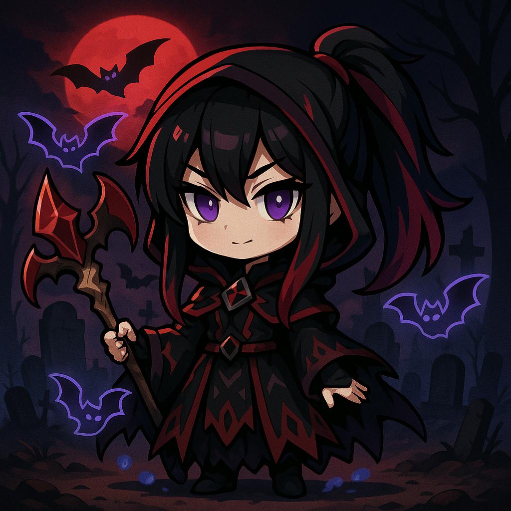 Description Block (Umbraven Necromancer) A mysterious young necromancer with long midnight-black hair streaked with crimson highlights, her piercing violet eyes glowing faintly in the dark. She wears a tattered yet elegant robe of deep black and crimson, decorated with intricate runes resembling bat wings. A jagged obsidian pendant rests on her chest, pulsing faintly with necrotic energy. In her hands she wields a bone-carved staff topped with a blood-red crystal shaped like a bat’s wing. Around her swirl spectral bats, their glowing forms flapping noiselessly as they weave through shadows. Her powers embody darkness, cunning, and control over the undead—granting her the ability to command bat swarms and drain energy from her enemies. Background: a moonlit graveyard shrouded in mist, with crooked tombstones and twisted trees looming in the distance. A crimson moon glows overhead, casting eerie light across the ground as shadowy bats scatter into the sky. The scene reinforces her role as the Umbraven Necromancer, a master of forbidden magic blessed with the unholy power of bats.