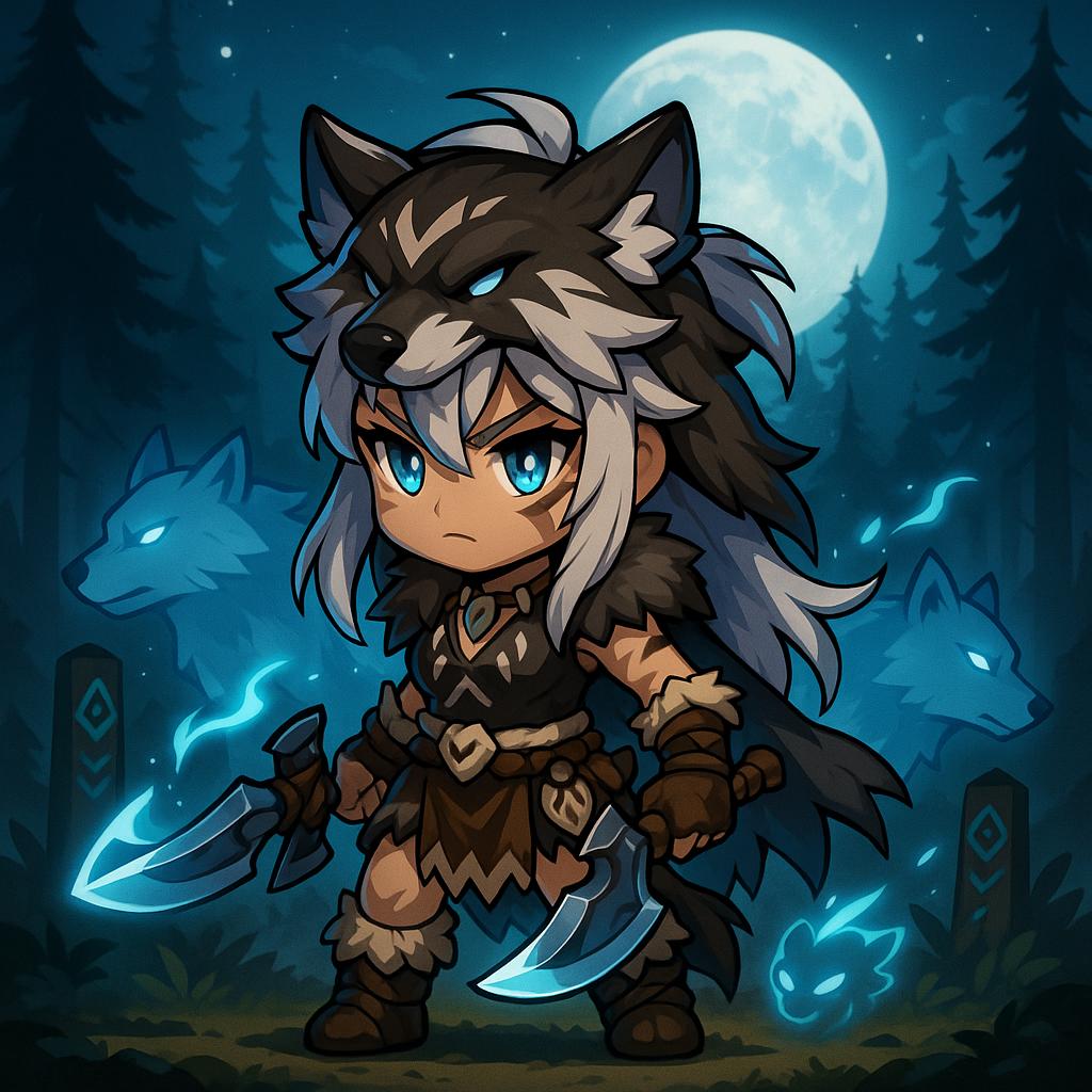 Description Block (Lunaris Huntress) A fierce young tribal warrior with long, wild silver hair tied back with leather cords, her sharp blue eyes glowing faintly like moonlight. She wears battle gear of fur, leather, and bone, decorated with tribal markings resembling wolf fangs and claw patterns. A wolf pelt drapes across her shoulders like a cloak, its head forming a hood that enhances her primal presence. She wields dual axes forged with silver edges, their blades glowing with faint lunar energy. Spectral wolves prowl beside her, their eyes shining brightly as they echo her movements, ready to strike at her command. Her powers embody ferocity, teamwork, and loyalty—granting her the strength of the pack and the endurance of the wolf. Background: a misty moonlit clearing deep in the forest, with towering pines silhouetted against a glowing full moon. Ethereal wolf spirits dart between the trees, leaving trails of silver light in their wake. Tribal totems stand in the ground, marked with runes that shimmer faintly. The atmosphere reinforces her identity as the Lunaris Huntress, a warrior blessed with the primal might of wolves.