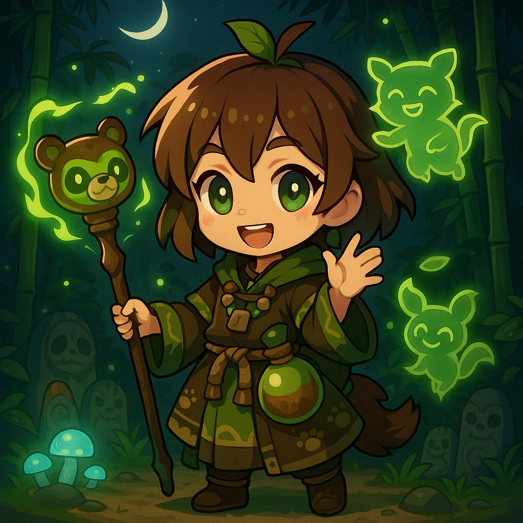 Description Block (Midorika, the Tanuki Shaman) A cheerful young shaman with short chestnut-brown hair tied with leafy ornaments, her bright green eyes glimmering with playful mischief. She wears a robe of earthy tones—deep brown, mossy green, and tan—decorated with swirling nature runes and stitched with patterns resembling paw prints. A necklace of wooden beads and lucky charms clinks softly as she moves, and a large gourd rests on her hip, glowing faintly with magical energy. In her hands she carries a shamanic staff capped with a carved tanuki figure, its eyes glowing faintly as though alive. Around her swirl ethereal tanuki spirits, laughing and shifting in playful illusions. Her powers embody transformation, protection, and trickery—allowing her to create barriers of leaves, summon spectral gourds that explode with mystical energy, and transform into protective spirit forms to shield allies. Background: a mystical forest clearing under the light of a crescent moon. Tall bamboo sways gently in the breeze, while glowing mushrooms and floating will-o’-wisps illuminate the ground. Sacred stones carved with tanuki faces line the area, and spirit gourds hover lazily in the air. The scenery reinforces her role as Midorika, the Tanuki Shaman, a joyful yet wise figure blessed with the magical powers of the tanuki.