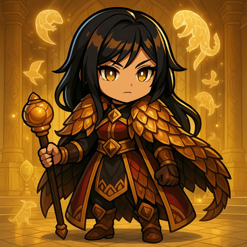 Description Block (Scalesovereign Empress) A dignified empress with long ebony hair streaked with bronze highlights, her golden eyes glowing with quiet strength. She wears imperial robes of deep crimson and gold, intricately embroidered with patterns of overlapping scales that shimmer like polished armor. Draped across her shoulders is a mantle shaped like pangolin scales, arranged into a regal cape that glints with protective magic. In her hands she holds a scepter topped with an orb encased in spiraling golden scales, radiating both elegance and power. Her gauntlets and boots are adorned with pangolin-scale motifs, granting her both defense and grace. Around her, spectral pangolins curl and uncurl in midair, their glowing armored forms circling her as guardians. Her powers embody protection, resilience, and the ability to defend her people with impenetrable resolve—just like the shielded might of the pangolin. Background: a grand golden throne room with walls carved in reliefs of scales and shields. Sunlight streams through tall windows, scattering light across the polished marble floors. Ethereal pangolin spirits move among the golden pillars, their forms glimmering like protective sentinels. The atmosphere reinforces her role as the Scalesovereign Empress, a ruler blessed with the unyielding power of the pangolin.