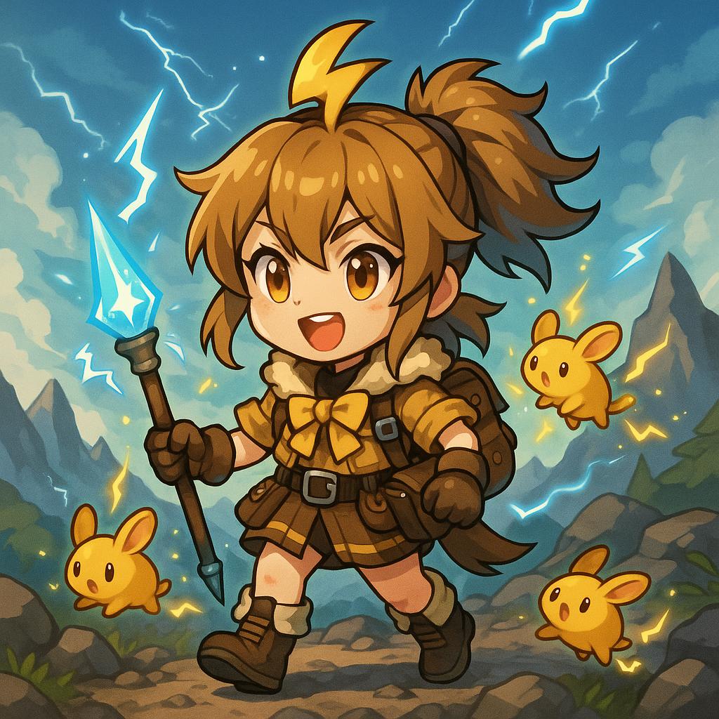 Description Block (Thundertrail Explorer) A cheerful young explorer with windswept golden-brown hair and bright amber eyes brimming with energy. She wears a rugged yet stylish adventurer’s outfit with yellow and brown accents, decorated with fur trims to reflect her bond with mountain-dwelling creatures. A utility belt packed with tools and climbing gear hangs at her side, while a small satchel carries her field notes and treasures. In her hands she wields a short spear tipped with a lightning-charged crystal, crackling faintly with static energy. Around her, spectral pikas dart and leap with sparks of electricity trailing behind them, their tiny forms buzzing with vitality. Her powers embody agility, adaptability, and the fierce endurance of the pika—allowing her to summon bursts of thunder and dash across cliffs with electrified speed. Background: a rocky mountain trail high above the clouds, with jagged peaks in the distance. Sparks of lightning streak across the sky, illuminating her path. Small pika spirits emerge from crevices, glowing faintly with electric energy. The scene reinforces her role as the Thundertrail Explorer, an adventurer blessed with the boundless vitality and lightning powers of the pika.