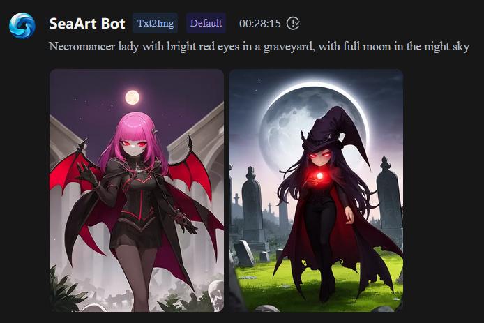 Same prompt: Necromancer Lady with bright red eyes in a graveyard, with full moon in the night sky By Gemini