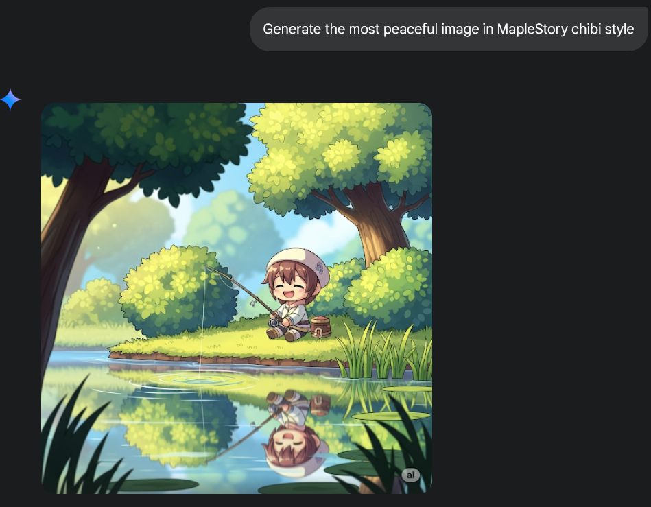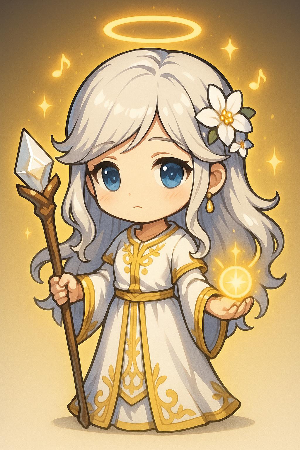 Prompt: Generate a MapleStory-inspired chibi (with SD proportions: big head, small body, glossy shading, and a cel-shaded anime MMO vibe) with the following description: the most peaceful image