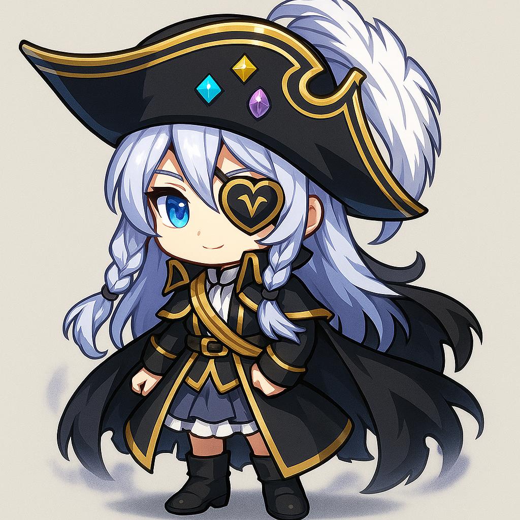 Description Block (Fog Admiral Outfit) A mysterious female admiral with long flowing silver hair and piercing blue eyes, wearing the full Fog Admiral outfit set with a Schwarzer Cape. She dons a large black bicorne hat trimmed in gold, decorated with colorful jewels and a sweeping white feather plume. Over one eye she wears a black eyepatch marked with a golden heart. Her coat is a sharp black-and-white admiral’s uniform with golden trim and a commanding sash, paired with a flowing black cape that billows like fog. Sleek black boots complete the look. She radiates the aura of a phantom admiral, as though she commands a fleet sailing through mist and shadow.