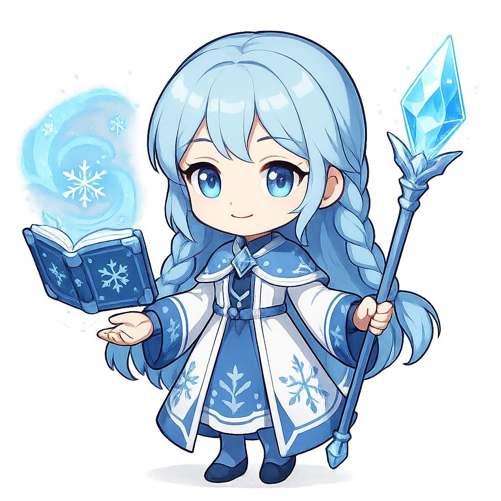 A serene young mage with long icy-blue hair tied in twin braids, shimmering silver-blue eyes, and a gentle smile. She wears an elegant white and blue robe adorned with delicate snowflake motifs, carries a floating spellbook surrounded by swirling frost glyphs, and wields a crystalline staff tipped with a radiant shard of frozen magic.