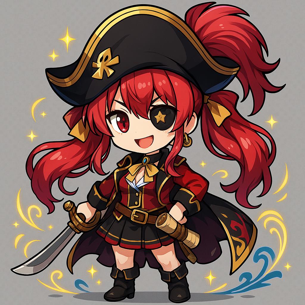 Description Block (Scarlet Pirate Captain) A daring young pirate captain with long flowing crimson hair tied into twin tails, decorated with golden ribbons. Her lively ruby-red eyes sparkle with confidence and mischief, and her playful grin hints at adventure. She wears a stylish pirate-themed outfit: a crimson and black short coat with gold trim over a festive blouse, a pleated skirt, and tall black boots with buckles. On her head rests a large black tricorn hat adorned with a crimson feather and a golden emblem. She carries a polished cutlass at her side and a rolled-up treasure map tucked into her belt. Faint golden sparkles and ocean wave motifs swirl around her, as though she commands both fortune and the high seas.