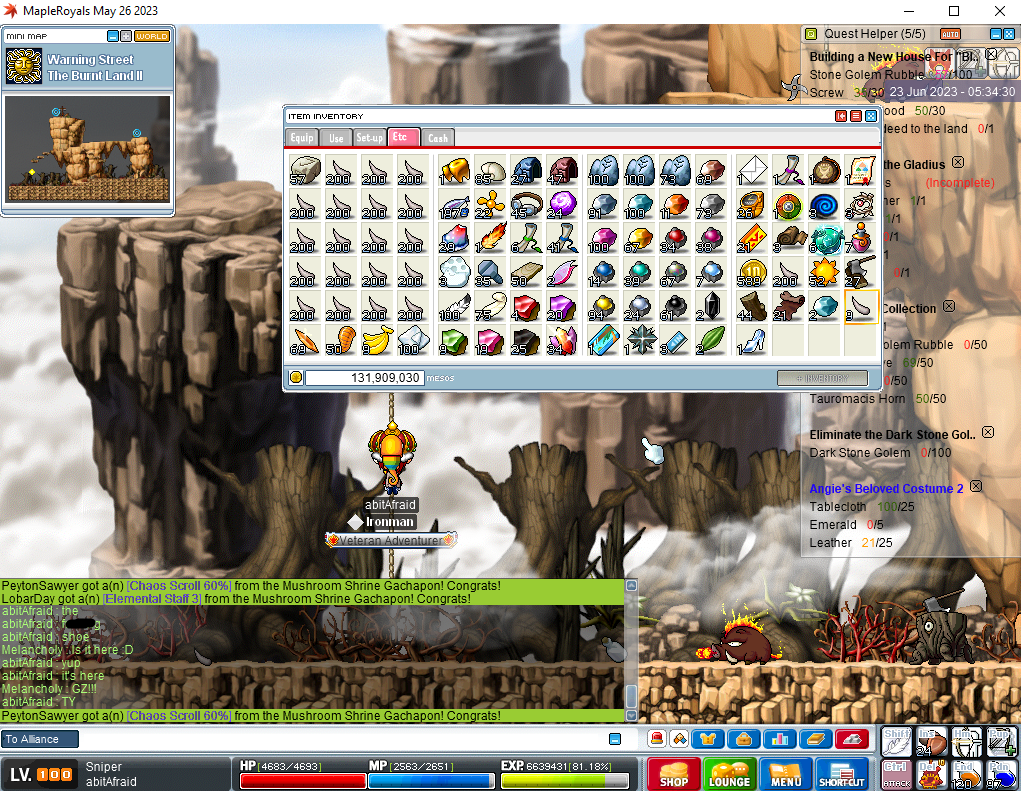 Hello Royallers! I'm here to post a new challenge of patience! We all know that "Arwen's Glass Shoes" is a super rare item in mapleroyal, it might even take ur entire life time to get one. So let's make a challenge, to see who is the "luckiest". Rules: 1. Go to The Burnt Land II in Perion with no party 2. Start farming for Arwen's Glass Shoes 3. Collect every fire boar's tooth u farm in this map 4. U can go back to town to refill potions or sell equips, coz ur inventory is gonna be full of low level equips. U can sell anything but the fire board's teeth. 5. Once u got the rare item "Arwen's Glass Shoes", stop farming. Open ur inventory. Count how many fire boar's tooth you have farmed, and take a screenshot. 6. The one who get Arwen's Glass Shoes with least fire boar's teeth in the inventory shall receive our respect and honour. While the one with most teeth... well... sir/ma'am, major respect to ur patience. Post ur result in this thread! Let's see who's the "luckiest"