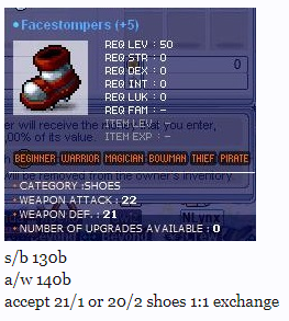 Just an outsider looking in - there isn’t a set price for high wa gear, or any item for that matter - the price is determined by the demand/supply of the item at any given moment. There really aren’t many 22+ shoes out there, but this post from last year valued them at 120b and 21 shoes at 90b (so a 30b top up would be reasonable) during a time where player count was much higher and demand was also likely higher: https://royals.ms/forum/threads/23-att-fs.172875/#post-1010706
