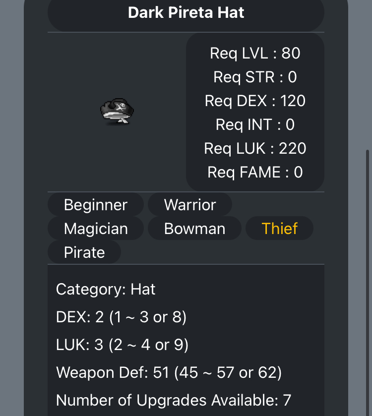 Buying clean dark Pireta hats with 9 luk and prefer 8 dex and close to or max defense