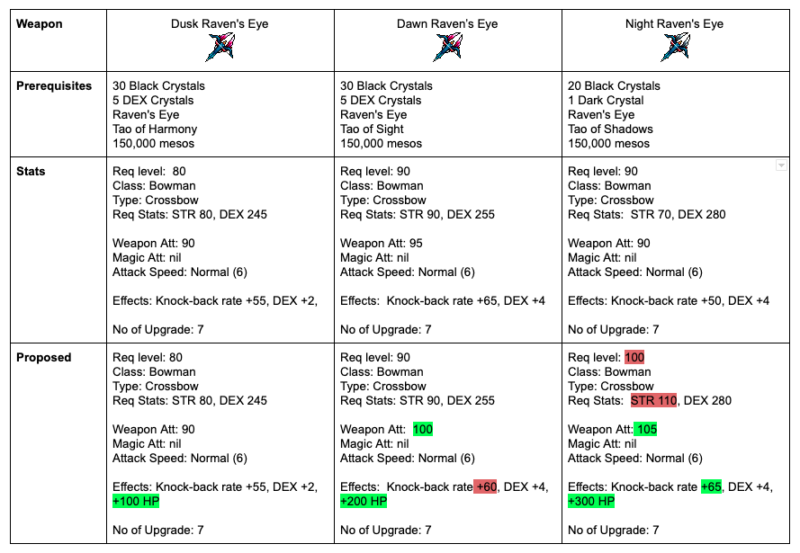 Lastly, I think these weapons could be used as another opportunity for players to gain additional HP. This could be helpful to bring more leverage to more unpopular classes and range classes who seek additional ways to gain HP while playing. like for the crossbowman, we should consider adding HP stats for crafted crossbows, in order to encourage more players to play them as an alternate to the common Bowmasters pathway.
