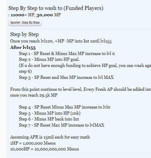 I updated this when we figured out the MAX MP increase mechanic, i believe this is still up to date other than the 15mil/APR part. - For 10k / 20k, just play and wash your bishop normally by +5MP -5int every level. once you have a large MP pool (or your existing one), -MAX MP increase skill to lvl 0, with 1 AP in your MP pool, remove the MP until you get the HP desired, and remove that 1 AP pool back into int. Continue leveling and + MP with fresh AP, -MP using APR and add int until you have the MP pool desired.
