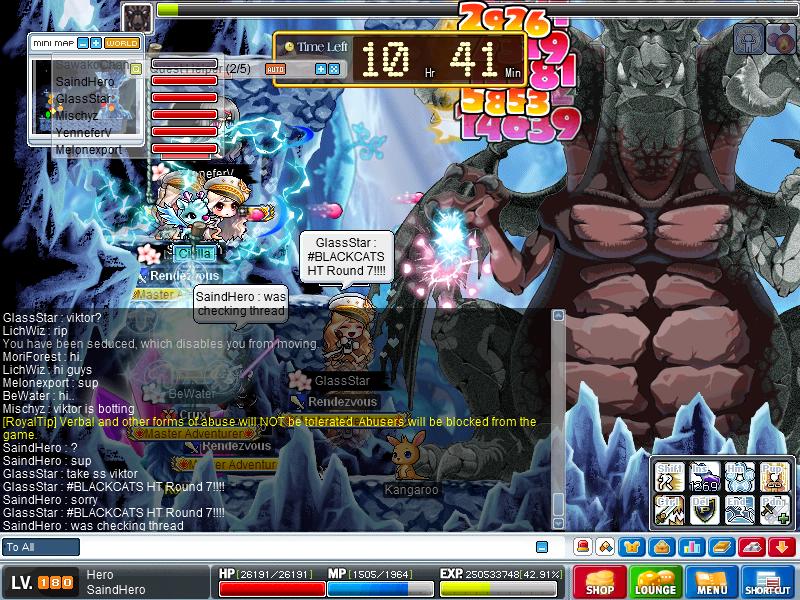 #BlackCatsHT Round 7 !!! Finally here with Rachel and her unimpressed Kangaroo !! Thanks again @iSaind for the screenshot The Squad Party 1 1. itisKate (18x BM) 2. YenneferV (16x NL) 3. GlassStar (19x NL) 4. Mischyz (19x NL) 5. Melonexport (18x Bishop) 6. LichWiz (16x I/L) Party 2 1. YuuBB (15x Hero) 2. MoriForest (17x Bishop) 3. BizaZoe (17x BM) 4. SaindHero (18x Hero) 5. BeWater (15x Hero) 6. SawakoChan (200 BM) Extra Party No Shows - Casualties itisKate YuuBB BizaZoe SawakoChan Drops The average drops of this run were: Blizzard 30 Time Leap 30 Snipe 30 All books have been put into BCHT Vault 1 Genesis 30 has been claimed from the BCHT Vault by GlassStar on May 3rd ! 4 NX were given to: GlassStar, SaindHero, YenneferV, Melonexport 2 Pendants were given to: LichWiz, BeWater Egg given to: LichWiz Thanks to everyone who has attended !! The point tracker has been updated ! Do check it out and if there are any queries, don't hesitate to approach us ! Apologies again for this very late post of the run .. Stay tuned for BlackCatsHT Round 8 !!! <3