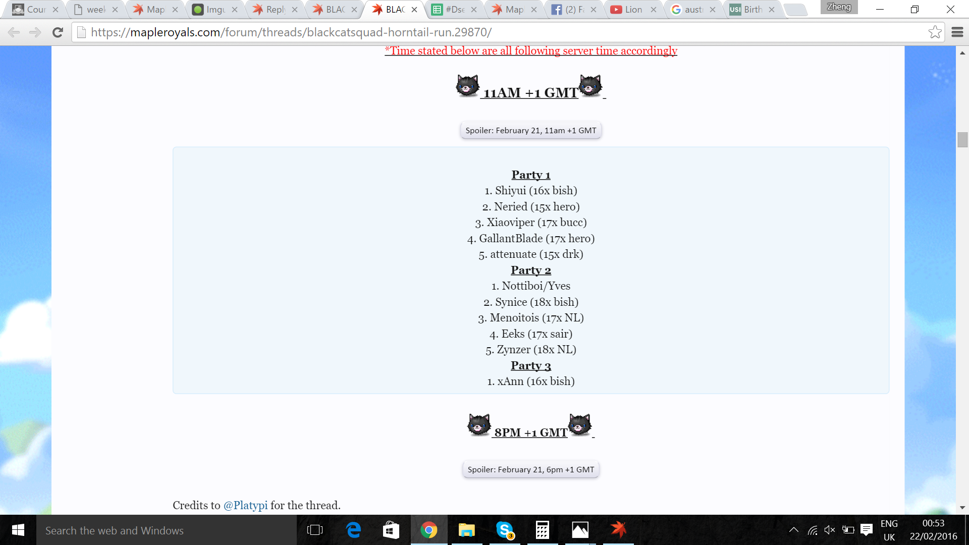 Des, I need to cancel my run on the 20th 11am GMT+1 due to a sudden work shift. I'll be there the 21th 11am GMT+1. (I don't see my name on party1/2 yet, can u update my name on it?) IGN: xAnn Job/Level: Lv167 Bishop Needed Loots: HTP, Egg Date(s) attending: 21 feb both 11am GMT+1 Health points: 2.2k