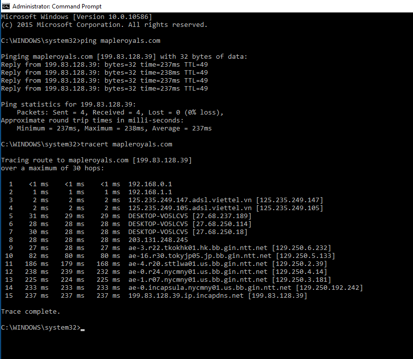 Our DDoS protection service have confirmed there are no IP blocks in place and that the issue lies with your ISP. Either there is a problem at your ISP and some websites/IP addresses are not accessible, or the ISP has purposely blocked access in a censorship type manner. If we have been censored then unfortunately there's nothing we can do as there are no avenues for managers of blocked websites to appeal censorship decisions in Vietnam. The only thing you can do is contact your ISP Viettel and ask them why you are unable to access 107.154.50.193 (mapleroyals.co) and if there is anything they can do to fix it.