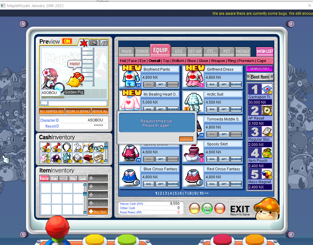 Cash shop reservations don't work. Additionally, once you try to reserve and fail to reserve, you can't buy anything in the Cash Shop. EDIT: You also can't remove anything from your Wish List. Attempting to remove something from your Wish List doesn't seem to break the Cash Shop like adding something does. EDIT 2: Sorry this is a duplicate of https://royals.ms/forum/threads/cannot-add-cash-shop-item-into-wish-list.200438/ - feel free to move to closed.