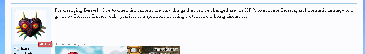 Yeah honestly wtf, not a single person replied to my arch post, page four in this very thread https://royals.ms/forum/posts/1096304/ -- literally nobody cares about arch mages. Why are we ok with this leeching/mule shit, it's so bizarre and boring. Ultis are fairly bad in bosses, and arches have no 1v1 edge, just close the 1v1 gap, nobody is suggesting arches blow BM/MM away and even if the gap is closed, there's still the party meta, nobody is bringing arches along except for fun... remember fun? that's the point. Why is everything so toxic, not balancing them and giving them the option to participate at all reinforces the leeching/farming/washing/top100 economy meta, like who gives a shit. It would be cool too if you can't find any buyers to go out on some boss runs, you'd think, but, as it was recently mentioned, it's counterproductive for arches to level over 140. So since that isn't fixed or rounded, that also reinforces the washing/leeching/top100 nonsense even more. Nobody is gonna stop washing chars or doing gacha runs, the economy will be just fine with or without farmers, since about 150b is generated every day just from ws/cs alone The mention of mages helping paladins? No, I disagree. You'd need the right one first of all for the right boss, and this is the absolute wrong way to approach arches, to be paladin mules. That's not fun at all either. Buff their passives, buff I/F demon, have big bang push mobs at a rate lower than the NL skill, have demon give a boss only bullseye effect that boosts paralyze and CL, have infinity be a party skill that gives everyone unlimited mana, buffs all m.att and increase all magic attacking skills, ignore m. cancel, or give a m. crit, it's only 40 seconds at max per 10 minutes. let them have fun like jeeesh. Nobody is saying make mages stronger than any other class, but don't take them completely off the table. If some arches want to krex, they should be able to. If three or 4 want to shao, they should, everybody else gets to, it's fun Same for bossing with PA or 2hbw, no reasons these aren't viable options for players (suggestions for both PA and 2hbw in this thread) https://royals.ms/forum/threads/general-warrior-feedback-useless-skills.160831/ Or put a cooldown on the ultis. Don't care who this insults, if the ultis are what break the mages and carve out this bizarre culture, then nerf the ultis and buff the other skills so players don't just make arches just to camp maps and leech, there's no party play in that at all, it's a problem, really. Just give players 100-120 more party content or incentive. If leeching is an option, people don't even want to play the game. However it works for the server because so many classes have to wash for different reasons if they want to enjoy late game, so of course the toxic leech culture thrives, instead of just making slightly more HP available and bosses slightly more difficult... ...