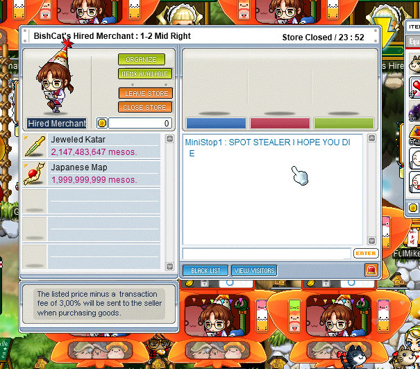 3. DETAILS: MiniStop1 closed his store on a space that was able to fit 2 stores, i was fast enough and managed to open my store on the far right, and while he was false accusing me of botting and telling me to die irl some1 acctualy got his spot lol. Just wanted to report him for being toxic and rude.