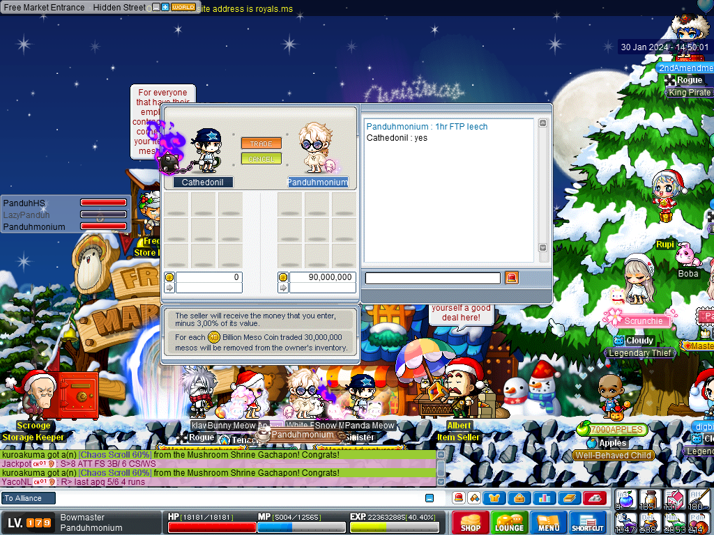 1. IGN: Cathedonil (Guild: Sinister) 2. REASON: Poor leech 3. DETAILS: I saw him smega selling leech. I asked for his rate for FTP leech. He said 45/90. I asked his level to see if it warranted the 90mil price for FTP. He said he was 125. I paid him for 1 hour then left for work. Came back and only got 1 full level 70 -> 71 after 1 hour of ftp leech. Tried to talk to him when I found him leeching again. But no response but was actively leeching someone else from Northern. Typically I dont care if your leech is not great but 1 hour solo leech for only 1 level at level 70 and then to not even bother responding? Are you botting?