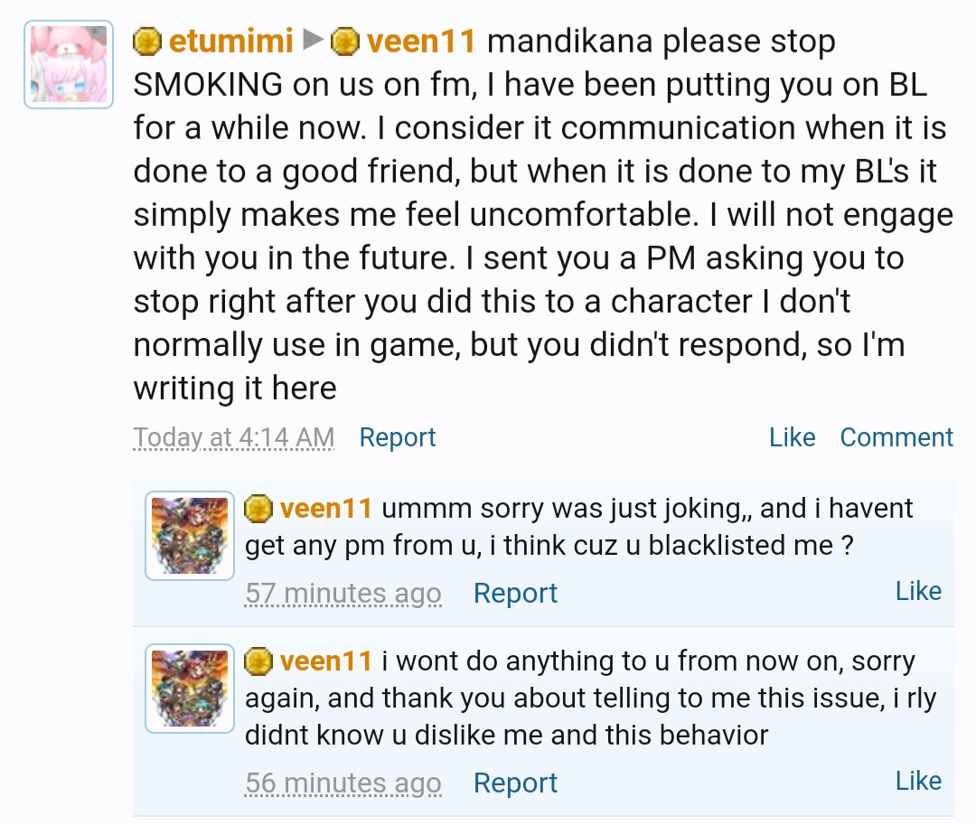 First, regarding SMOKE, I did not send him a message that day. I sent him a PM with the character Etumimi and told him to stop. When he did not respond, I went to the trouble of posting on his forum account. I did not come here to report what happened that day, I came here to talk to him directly because he kept repeating the same thing over and over. I had learned from past incidents that it is tough to sue without multiple pieces of evidence from the gm who stalked me before this incident, so I left some evidence before this happened. However, after I left my comment, you told me that it was in no small part a joke and that you were sorry, so I forgave your actions only on the assumption that I would not get involved. (I don't know why your comment was deleted, but I remembered this comment of yours). You are right, I have not had a SMOKE since this incident. I am sure you understand. That does not change the fact that I will not engage with you and the blacklist in my mind will continue. I have removed all evidence. First of all, I have seen you and your second shadow on fm in the past. At that point I was not 100% sure about the possibility of your sub character. You are also correct that a 170 lvl dirk from the same guild joined us. Then on the way to Golem, I noticed that FAME was down and sent a firm PM. It is just delusional to say that your pm is not coming at this point. After sending a pm and getting no reply from you I ran a smega for the character OBJET who came down the FAME with the name mandikana in the smega. As I had hoped, you replied to me with a smega with mandikana instead of OBJET. Now I am 100% sure that I am in the right place. If there is any harassment that you say I have carried out against you, please show it to me with photographic evidence. Otherwise we are not equal and if I am wrong in seeing it I can apologize unreservedly. Please don't do that because some people will only take your word for impression, and if I am wrong, please show it.