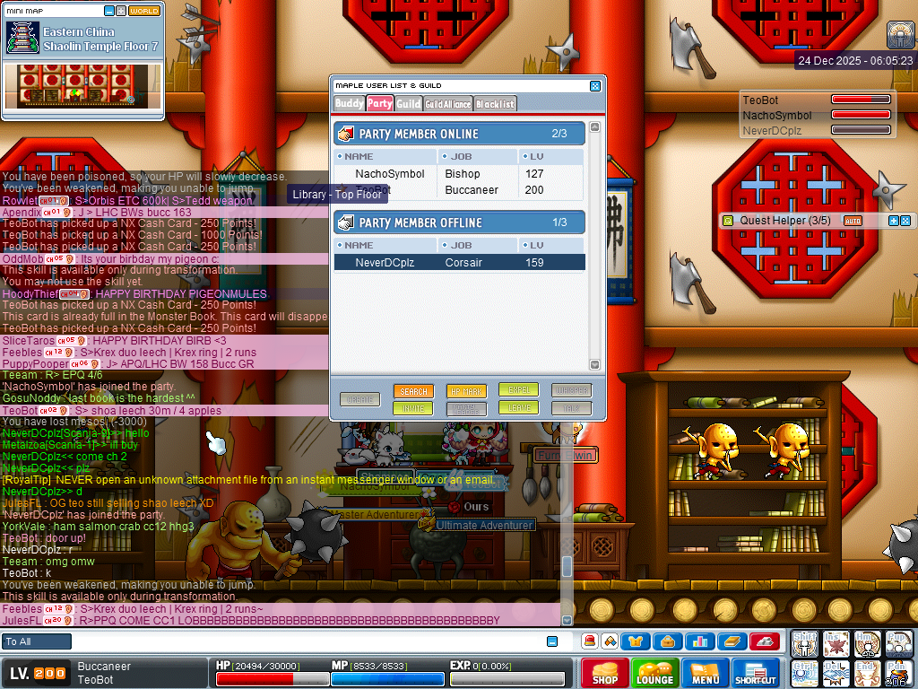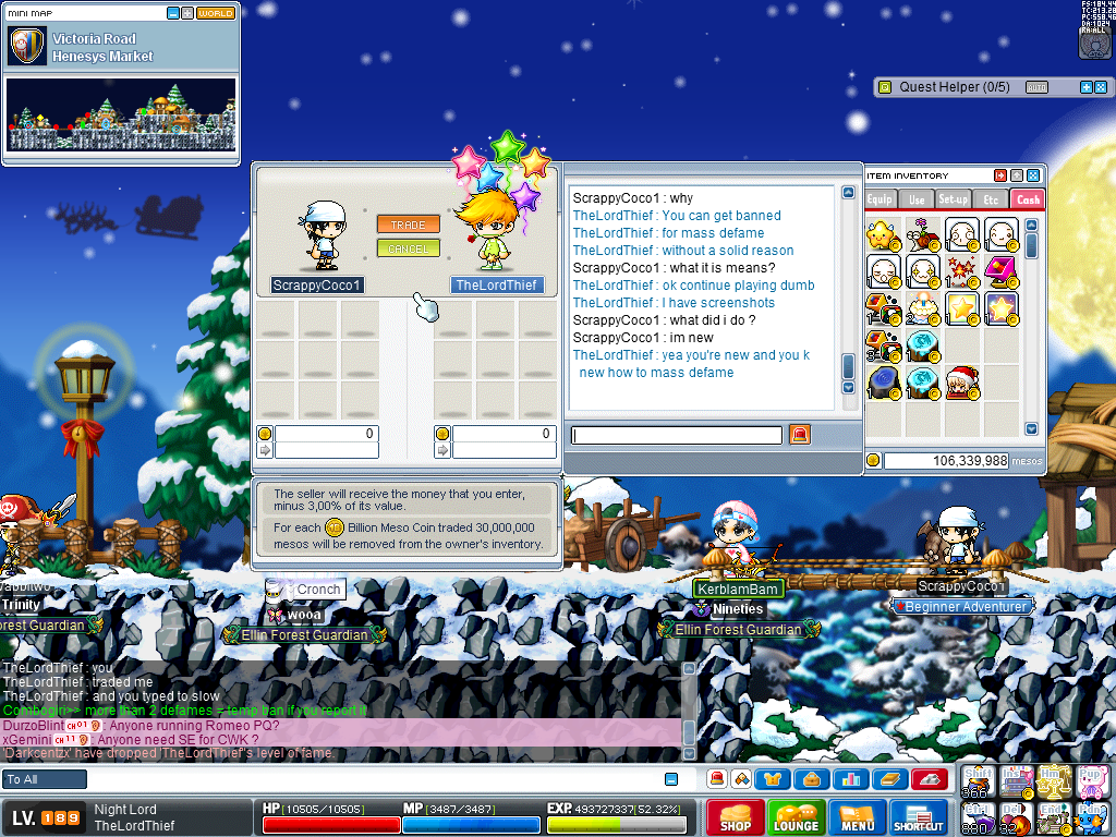 1. IGN: Strutter, ALPTAZAA, Twaster, PISTAL1, Darkcentzx (defame), ScarppyCoco1 (Harassment) 2.Reason: Mass defame & harassment 3.Details: I was trying to get to FM from Henesys market to check my store when a trade request popped up. I accepted the trade request and the window was there for a brief 10 seconds, the new player took too long to respond so I clicked cancel. Right at the very moment that I clicked cancel, he asked for some donations. I proceeded to enter FM and the mass defame started. The incident took place in Henesys Market, Henesys & Free Market. It was a total of 5 defames within the window of 5 minutes. I failed to capture the first one (strutter). He then brought another low level mule to taunt me further. I guess Henesys isn't a safe place for henehoes anymore Update: I met one of his characters while heading to submit Christmas dinner, I don't think he's new / poor ._.