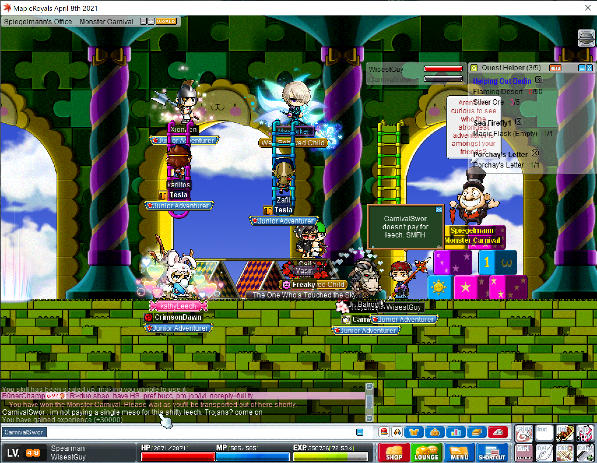 1. IGN: CarnivalSwor (Not sure if the "l" in Carnival is a lowercase "L" or uppercase "i" ) 2. REASON: Leech Scammer. He was buying CPQ leech for 8mil/1,000cp. I ended up getting more than 1,100 cp and after we got out he said "I'm not paying a single meso for this shitty leech. Trojans? come on" Even though I got more than 1,000 cp and he didn't tell me what he wanted. I attached a screenshot of what he said in chat.