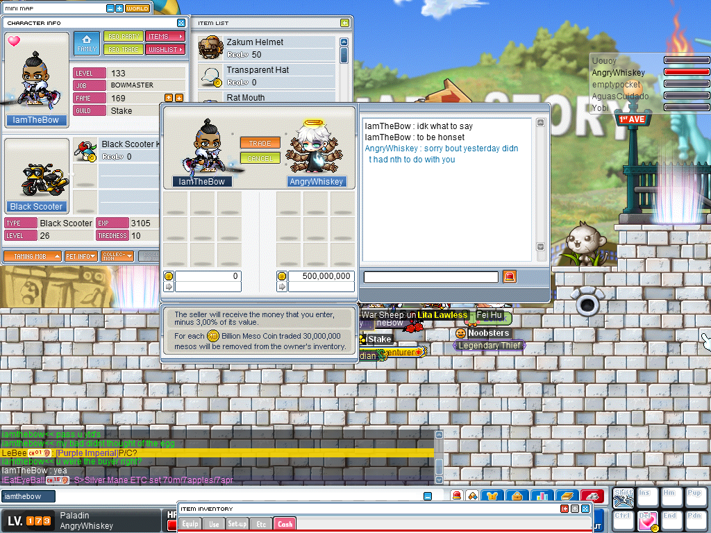 It is not suspicious. Suspicious would be that I join and ignore them. I wrote to them and one Afk in the FM i stayed there at the side of him more than an hour and he has not returned this one offline. I can return the mesos and it is more i can return to a bonus. As i said before. I have sold Leech to most of the players. And my account was created since 2013. I have never stolen anyone and I will not do it. I could not connect rapidio in my area left the light. Unfortunately Venezuela is like that. They raise rations and do not know when it will be. Well, I did not expect it at that time