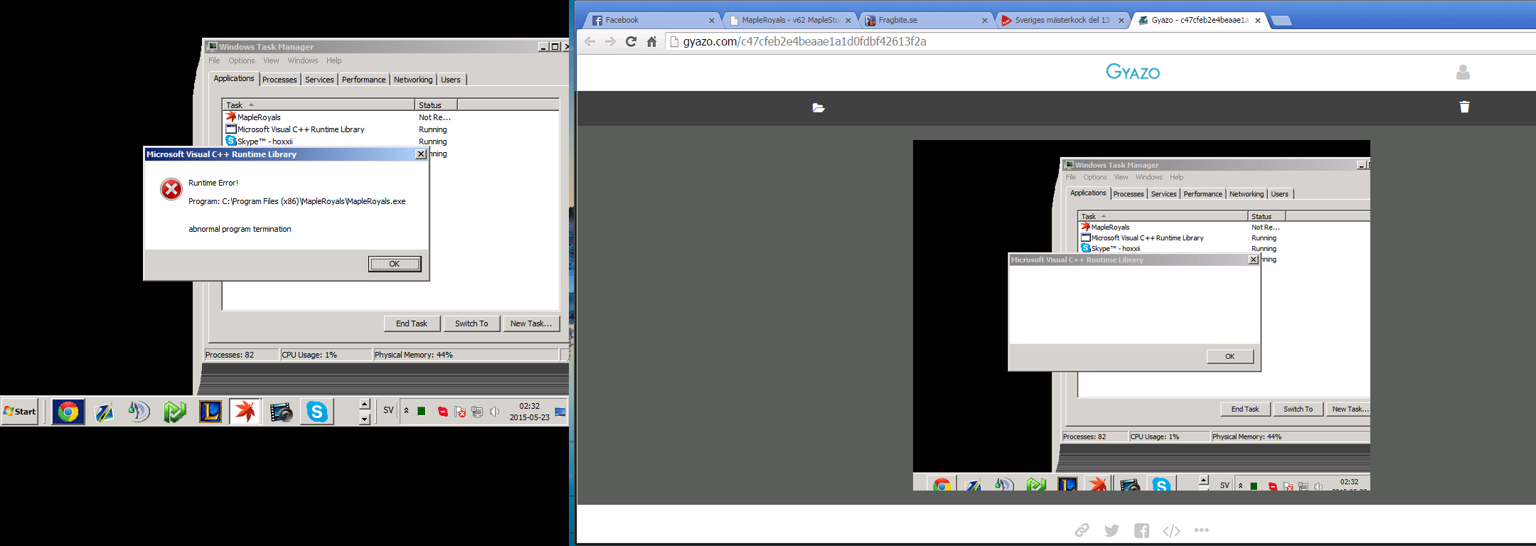 Hi so I did my first 2 runs yesterday and first run I just got random crash mid zakum when we were doing dmg on body. So I tried another run after that and I got normal dc + whole party when on arms so I guessed it was unstable servers. Then today I tried another run and I got through all arms and bodies and when we did the final blow to kill zakum I saw the xp show up to the right and I crash. Then I got some error message about runtime library c++. So I need help how do I fix the crash cause I really need a zhelm p and ~gm doesnt really respond ingame that's why I'm typing here on forum. Print of crash : http://gyazo.com/c47cfeb2e4beaae1a1d0fdbf42613f2a