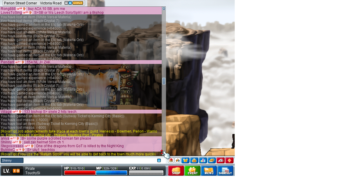 Details: While completing the brand masteria quest on my mule I turned in the required items of 1x white versal materia and 7 black crystal ores and the text box says i received 64k exp which would have leveled me multiple times from lv10 instead my character did not level the appropriate amount of times. I turned the quest in 7 times and only got from lv12-19 which is incorrect since i should have gained 448k exp. The required amount of exp needed to get from lv10 - 30 would be 426,181 according to http://bbb.hidden-street.net/experience-table