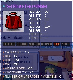 hey i can offer 24 luk 7 dex red pirate top +600m for your 27 luk 5 dex red pirate top