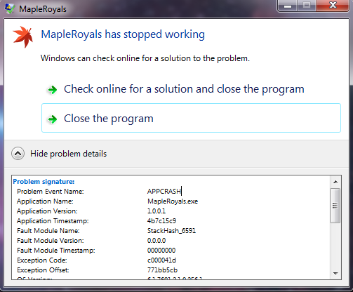 Downloaded MapleRoyals 3.0 and installed. Now I can't get the game to work at all. I get "MapleRoyals has stopped working" Attached is the screenshot of the error along with the error details.