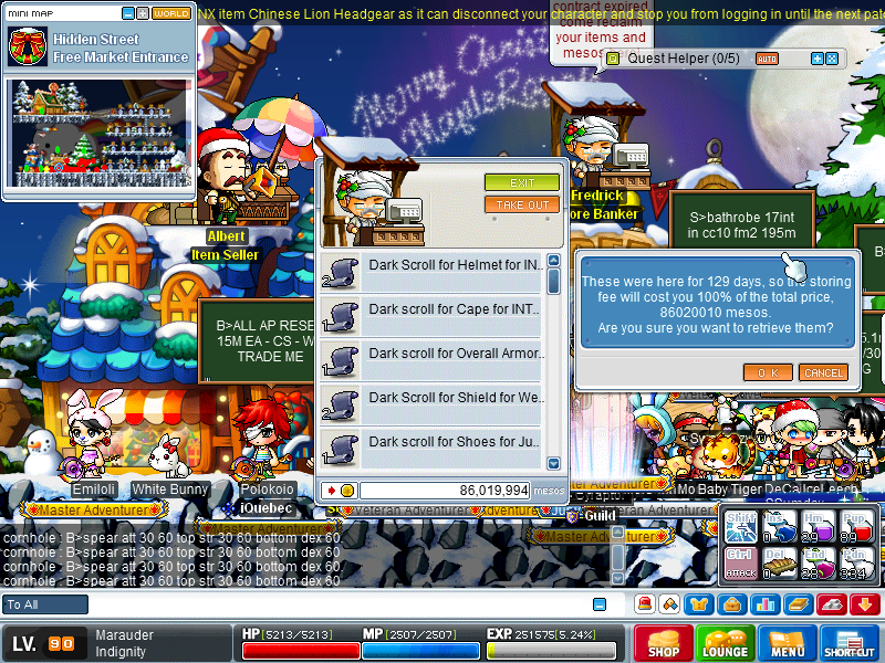 IGN: Indignity Problem: I have to pay 86 mil to get items back from Frederick and set up a store. Details: I play on and off when I can, and vote when I remember. My account is currently pretty broke but I have at least 300m+ worth of scrolls from gacha in my inventory. But Frederick has been storing my items, apparently, for 129 days and I have to pay exactly how much money I set the scrolls for to get them back. Like I said, I don't really have money right now and now I can't set up shop because Frederick has my items hostage. Any way an admin could help me (Like help me retrieve me items, remove the storing fee, or refund me the money I'll eventually have to somehow get to remove the items)? I can't state exactly what Frederick won't give back to me because the names are cut off.