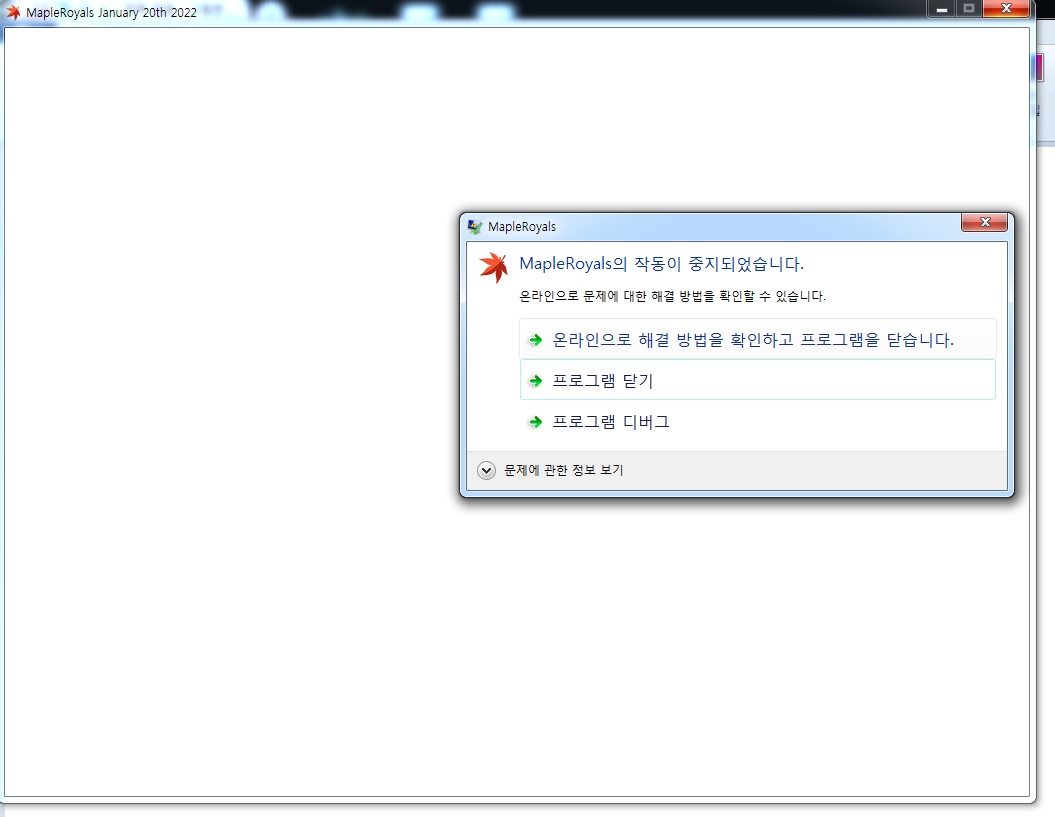 Pictures in the file says : 'Mapleroyals has stopped working.' You can check on-line for solution to the problem. -> Check on-line for solution to the problem. -> Close the program. -> Debug the program. - Before I install the latest version, I deleted the previous Mapleroyals files and installed the latest into the directory where previous files had been. - After I received the error message, I uninstalled and reinstalled into 'C:Mapleroyals'. But still received the message. - I tried 'Run as administrator' and tried each modes checked in 'Properties-Sharing'. It still didn't solved. My OS version in Windows 7 (64bit). Thanks for helping me solve the problem.