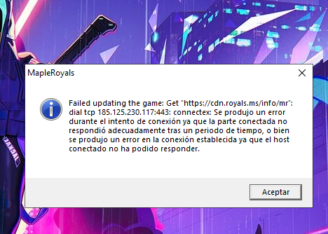 creo que el server está caído, y el error hace alución a que no se logró conectar si ya has jugado estos días y te salió solo hoy puede ser ello pero si apenas instalaste y te salió ello entonces puede que sea problema con el firewall(?)