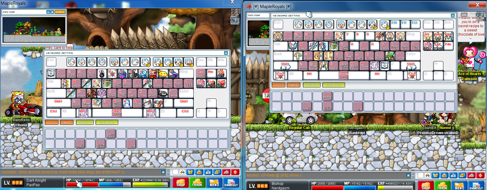 Bishop mac-user here. When I'm in battle mode, my left hand is in the same position as if I were typing, with my right hand on arrow keys. Left hand has access to all the skills/pots I use when I train/boss/pq Most used skill genesis on F, second most used skill tp on G. All important buffs on top row. Silver mane on A for quick movement during leeching (skeles, gobys) Q = magic guard, shouting "~bosshp" If/When I HT in the future, I will switch F to magic guard as well for additional protection against dispel (genesis is useless in HT unless I become shiyui in the future, 1hko wyverns). Playing mac means the quickslot keys are pretty much useless. I only use them to show cooldown of the skills that have cd. Res and Hero's will are mirrored on 0 and - Alt = Cmd on mac. Since many short cuts on mac has Cmd in it (e.g. close program = cmd+q), I don't want to put anything on it. I find shift is great for hp pot because it allows either of my hands to prevent death in case of emergency When I feel less stingy to spend nx, more emots will go to F9-12 XD I'm a quest enthusiast, so quest and quest helper keys are a must (; and .) If there's one change I would make, it'd be to to put part on O, buddy on P, guild on [ (to mirror respective chats on keys 2, 3, 4.