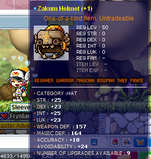 Finished my Zakum Helmet! Started with the clean Zakum Helmet: After using a Chaos Scroll on the Zakum Helmet: After using 16 WS + Helmet Dex 60% this is the result: