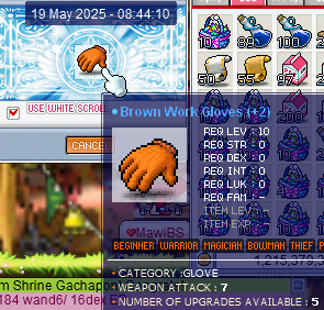 Today I bought a maple pyrope spear clean 101att 8STR! I spared some cs and ws, sold some cs and got up to 10ws. Then I bought 10% spear for attack scroll x10. Even with 1 hit I was happy but 3 hits in 10 ws! So the spear is now 116 attack, 17STR with 4 slots! Next session will be once I get 10ws again!