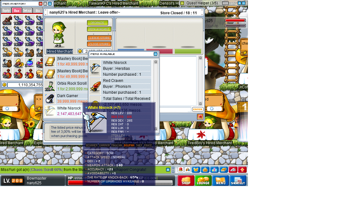 I thought i was the dumbest to purchase 100 heartstoppers for 300mils. I seriously didn't expect someone to be dumb enough to have his perfectly scrolled bow placed in his store without having sufficient mesos in his store to block the purchase of the bow. I doubt the buyer would sell it back to you unless you're willing to pay the market rate to buy it back.