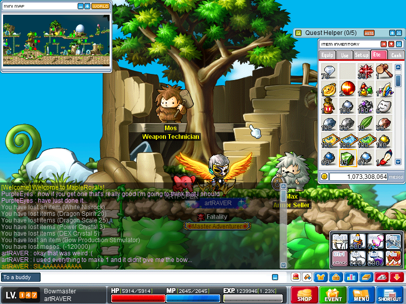 Sorry for a very late reply. You can only be refunded the items you have a screenshot of losing, which would be these: 1 White Nisrock 20 Dragon Spirit 25 Dragon Scale 5 Dex Crystal 1 Bow Production Stimulator 120 000 mesos Without a GM command right now it will be difficult to get the refund done right now.