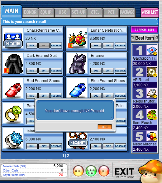 Hello, I wanted to change my IGN with the item from Cash Shop. When i buy it, after i put my birth date in, it always says "You don´t have enough Nexon Prepaid" but I have 6200 Nexon Cash and 20 Royal Points (dono) and the item costs 20NX.. I dont know what to do, pls help! screenshot below Best Regards, Jan