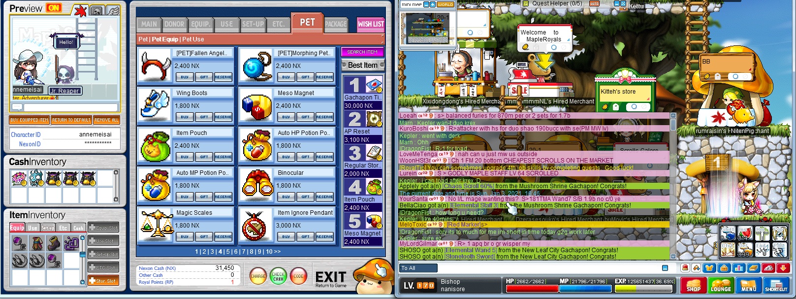 IGN: annemeisai. nanisore. Problem: NX Items disappear Details:when i want to trade NX item to another character,just unsuccessful.and can't drop these NX item. And when i put these NX item to gash shop and relog,these item all disapper. lost NX item is: item pouch wing boots magic scales binocular