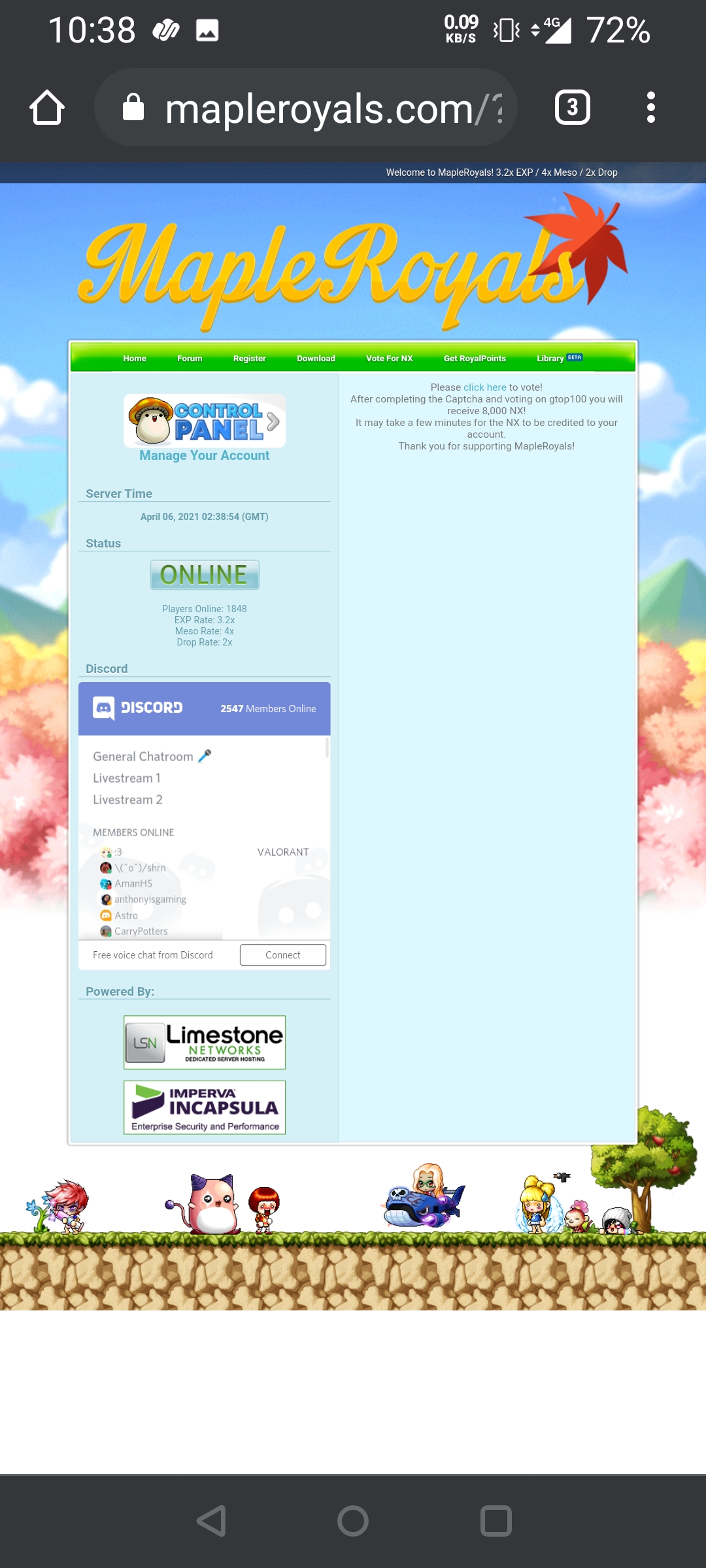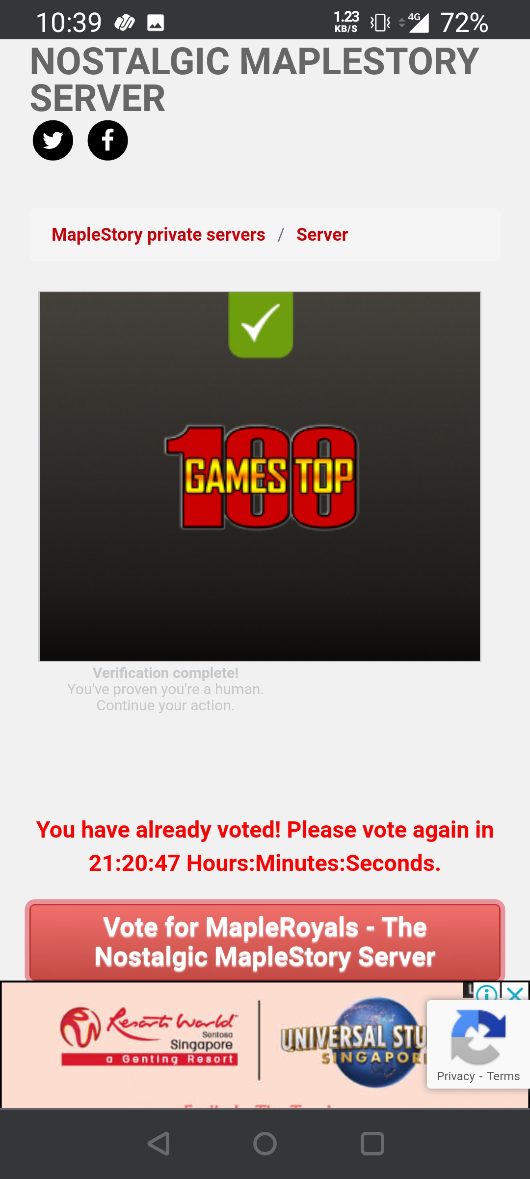 Details: hi gm, it's been 4 day since I'm unable to vote. They ask me to click on link to gtop100 . I clicked and did the verification and tried to vote. It keeps saying I've already voted when I'm using my 4G to vote. I've already been whitelisted. I've tried using other browsers and tried using other wifi, the timer just keeps resetting to 24hrs without allowing me to vote. I've tried most of the troubleshooting that you guys gave me too. Can you guys just pass me the nx or something? I just started mapleroyal and need some nx for my character. Hopefully you guys can or are able to help me.