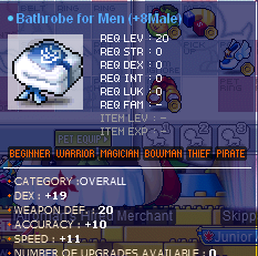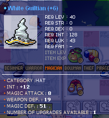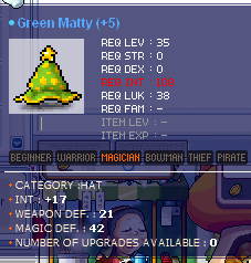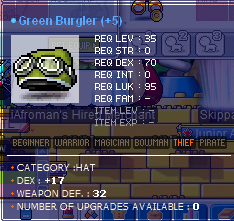 So ended up with a bunch of items I couldnt find their exact pricing - -19 DEX Robe -17 DEX Hat Green Burglar -17 INT Hat Green Matty -20 INT, 3 LUK Overall Orange Calas -12 INT, 8 MA Hat White Guiltian (1 slot remains) Hope I uploaded the pics right lol Thanks in advance