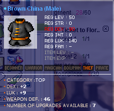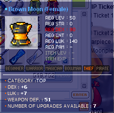 Items in each image: 2DEX, 8LUK level 50 male thief top 2DEX, 9LUK level 50 male thief top 6DEX, 7LUK level 50 female thief top