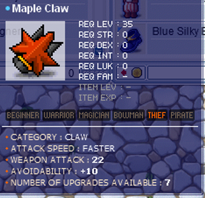 All equipment is clean Maple Claw: ATT:22/AVOID:+10 Maple Kandayo : ATT:26/AVOID:+19 Maple Wagner : ATT:62/ACC:+11/AVOID:+13 Maple Staff: HP:+102/WATT: 39/MATT:53 Maple Doom Singer: STR:+6/ATT:70/ACC:+33 Maple Shield (2): WD:15/MD:12/AVOID:+7 WD:9/MD:11/AVOID:+2 Maple Havoc Hammer: STR:+2/ATT:86/ACC:+36 Maple Soul Rohen: STR:+4/ATT:88/ACC:+39