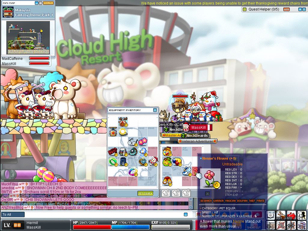 IGN: MassKiII (masskiii) Problem: Lil Nenne Pet Disappeared Details: Previously traded mp autopot to another character. Curiousity got the better of me and I attempted to do the same with a pet. The Trade window allowed me to put it in. Hit trade on both characters, window froze and was forced to cancel. Pet was gone. This occured on December 14th, approximately 9:27 UTC; see attached image.