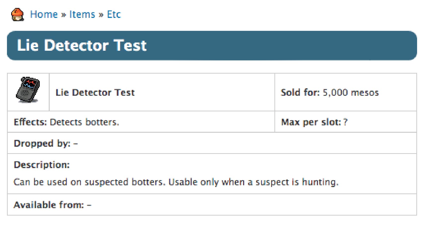 At the meantime, can we consider the implementation of the lie detector? I think it helps to reduce the manpower need of the staffs, while it will not stop hackers in Henesys but it will stop economical botters in Ludibrium Dungeon or Coolies.