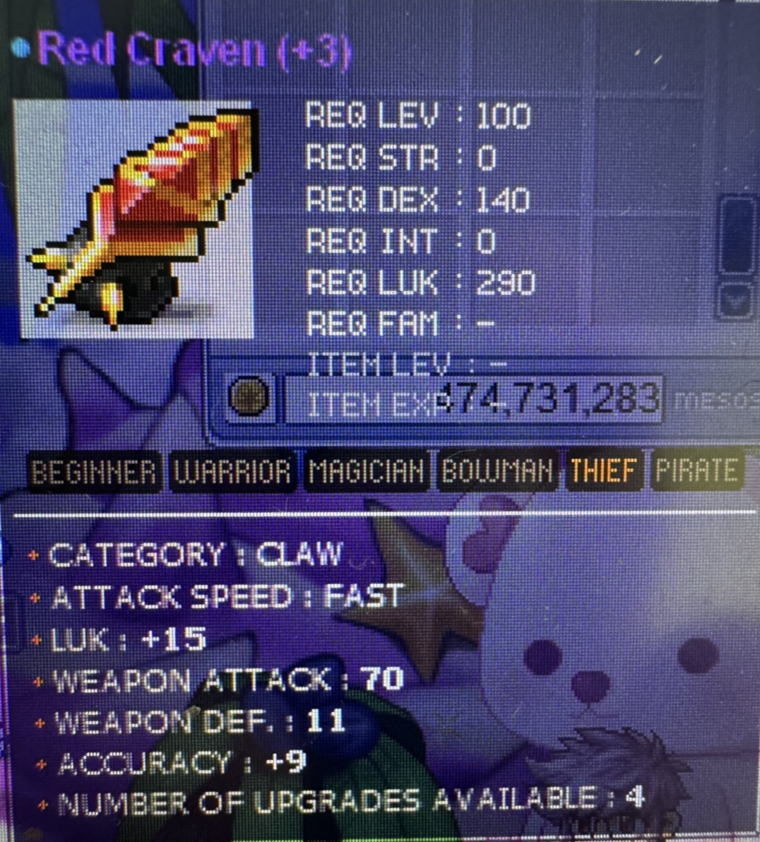 Freshly scrolled 15luk 70 atk 4 slot red craven